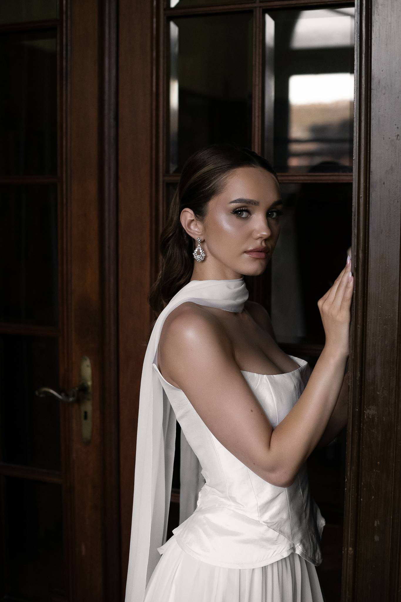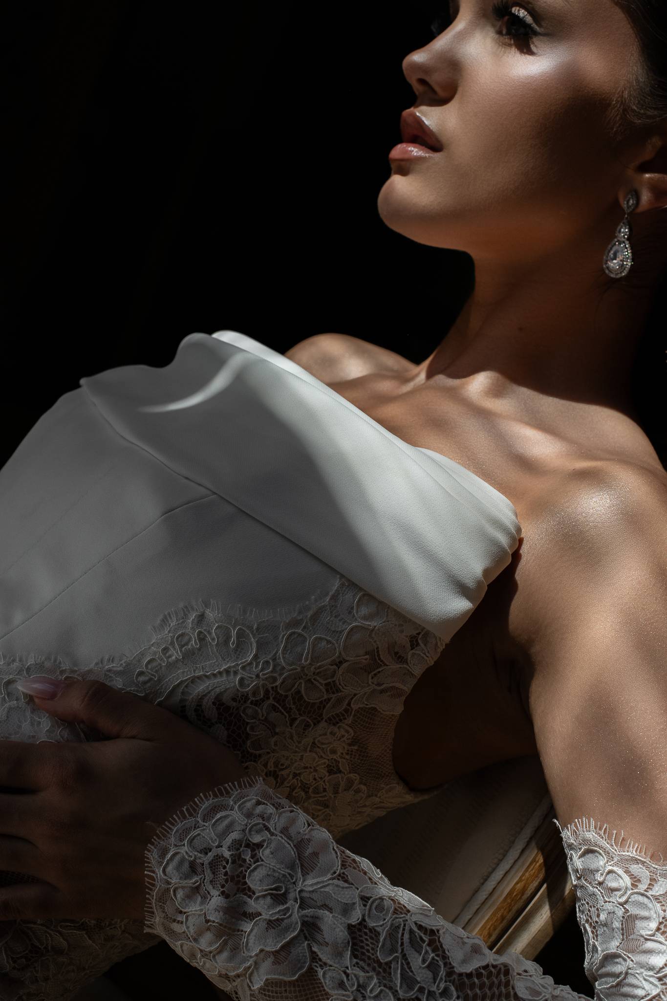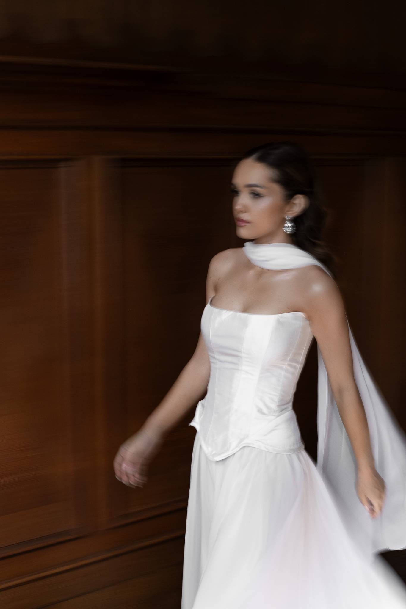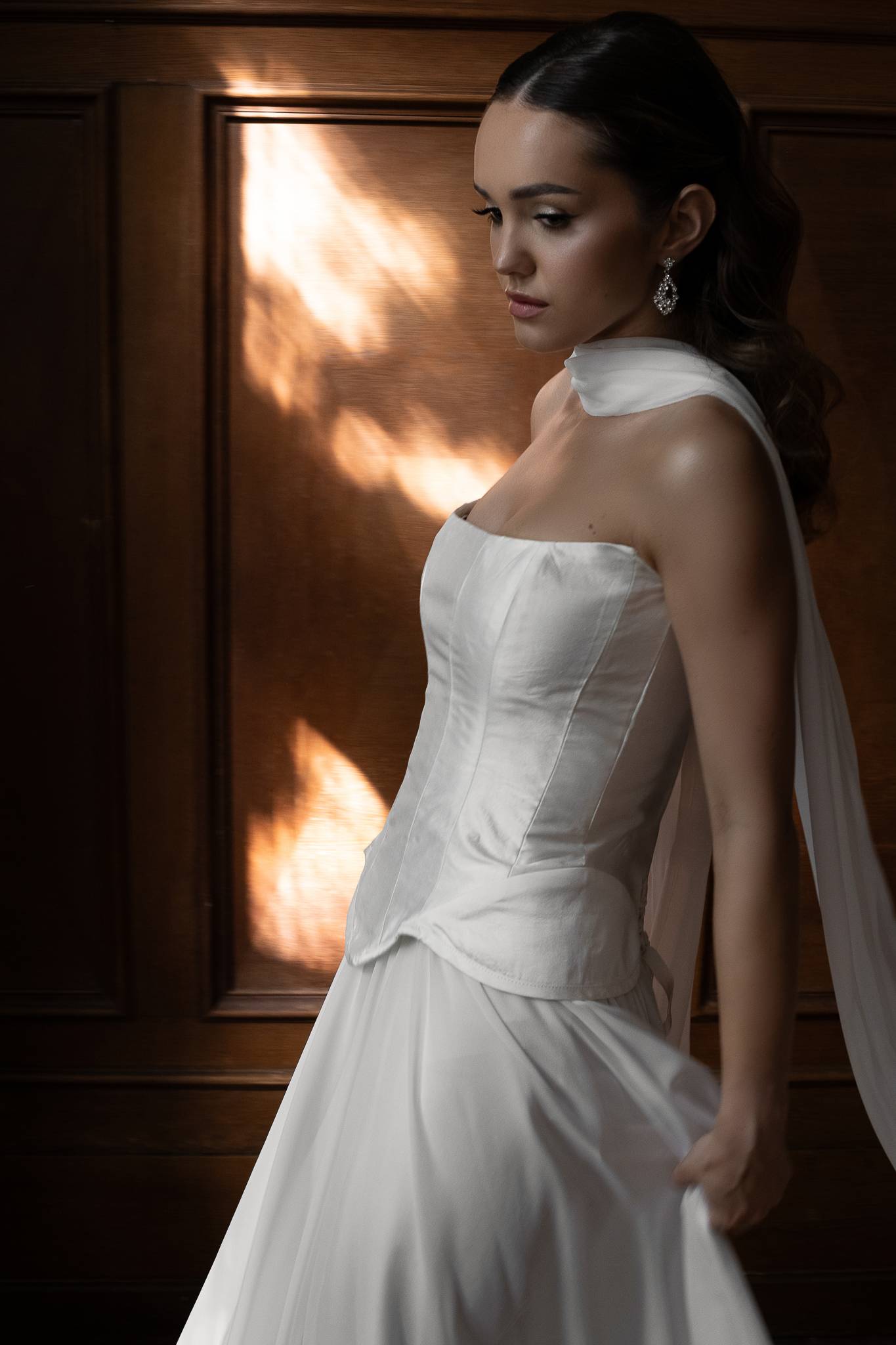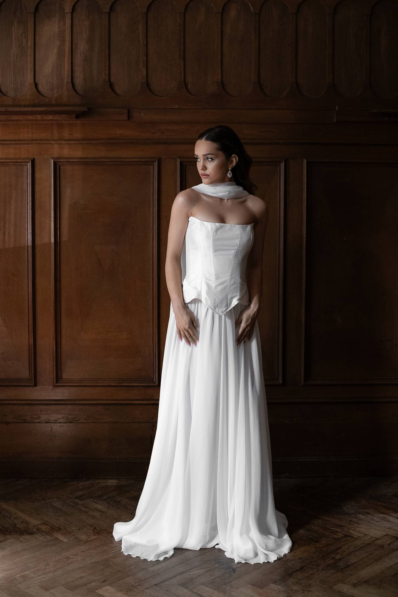 Elegancka i nowoczesna suknia składająca się z trzech oddzielnych elementów. Nowoczesny krój gorsetu pięknie modeluje sylwetkę, muślinowa jedwabna spódnica dodaje lekkości, a delikatny szal wytwornie dopełnia kreację.
