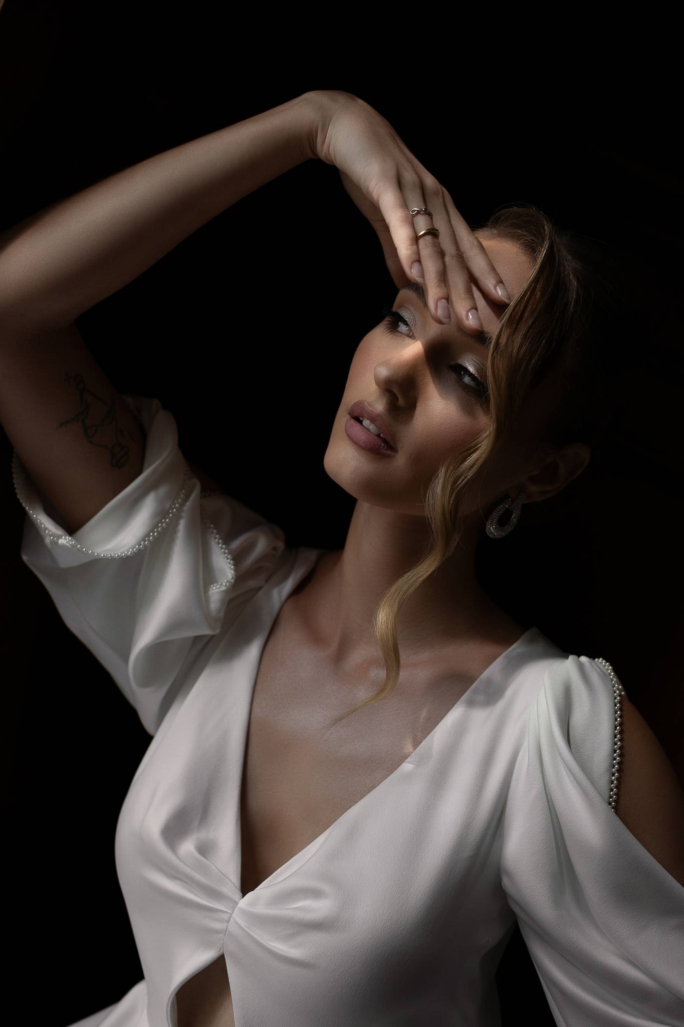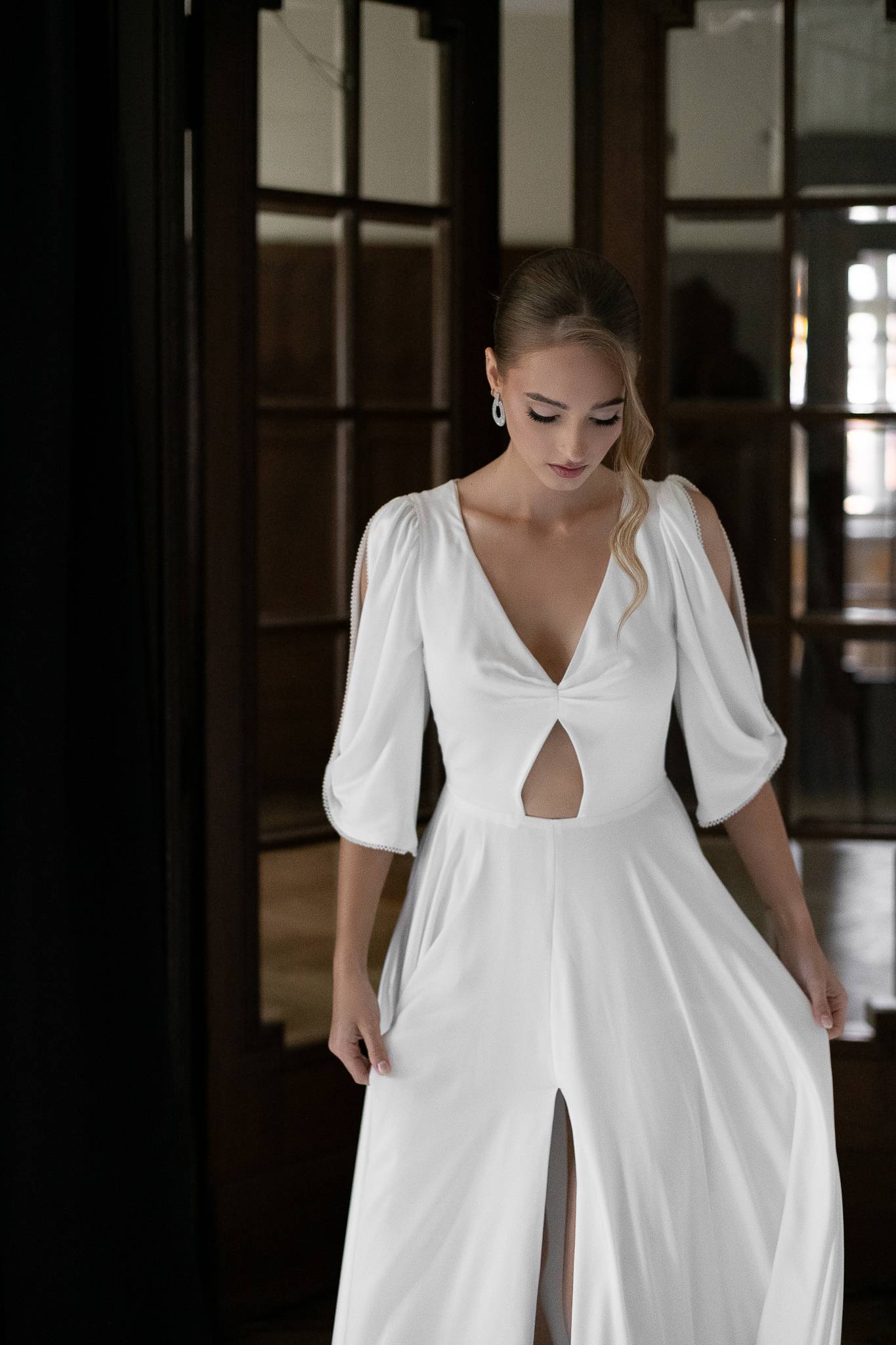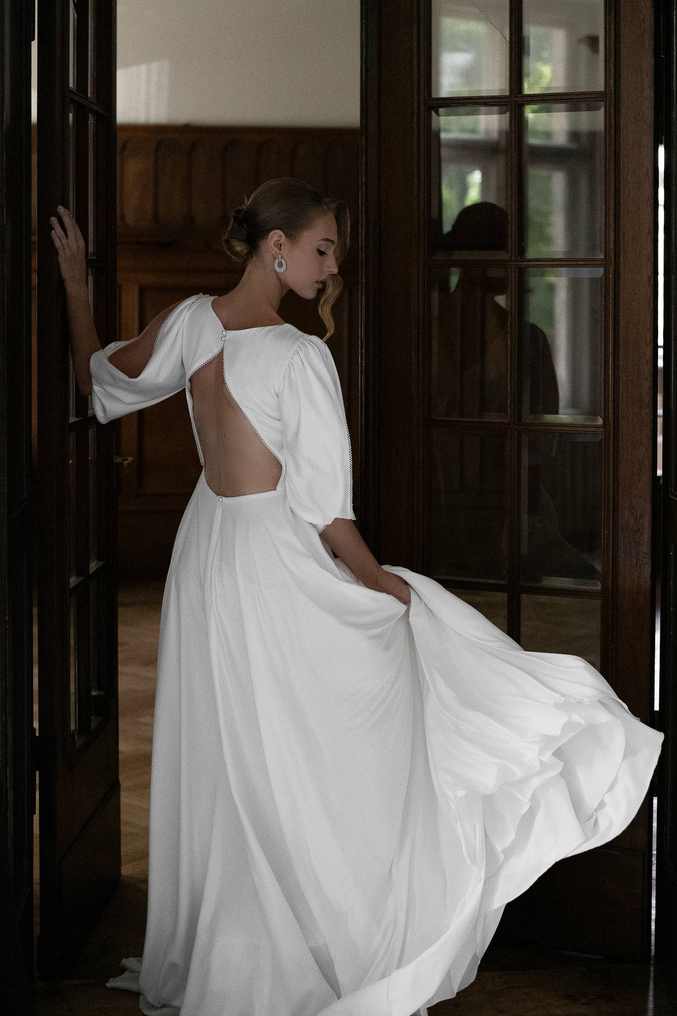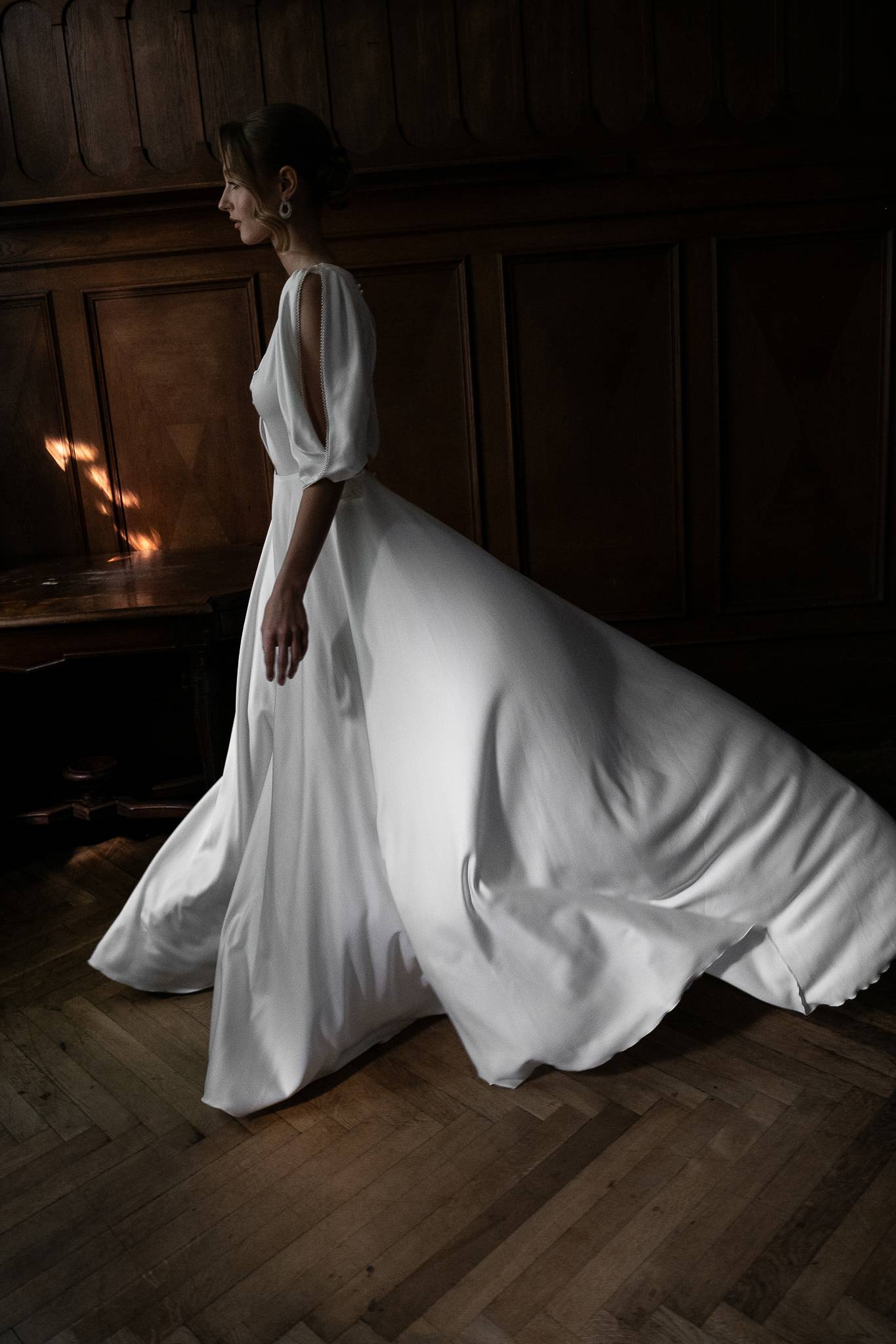 Suknia z lekkiej lejącej tkaniny z połyskiem z podpinanym trenem i rozcięciem z przodu. Bufiaste rękawki i perłowe rękawki nadają sukni elegancki charakter.