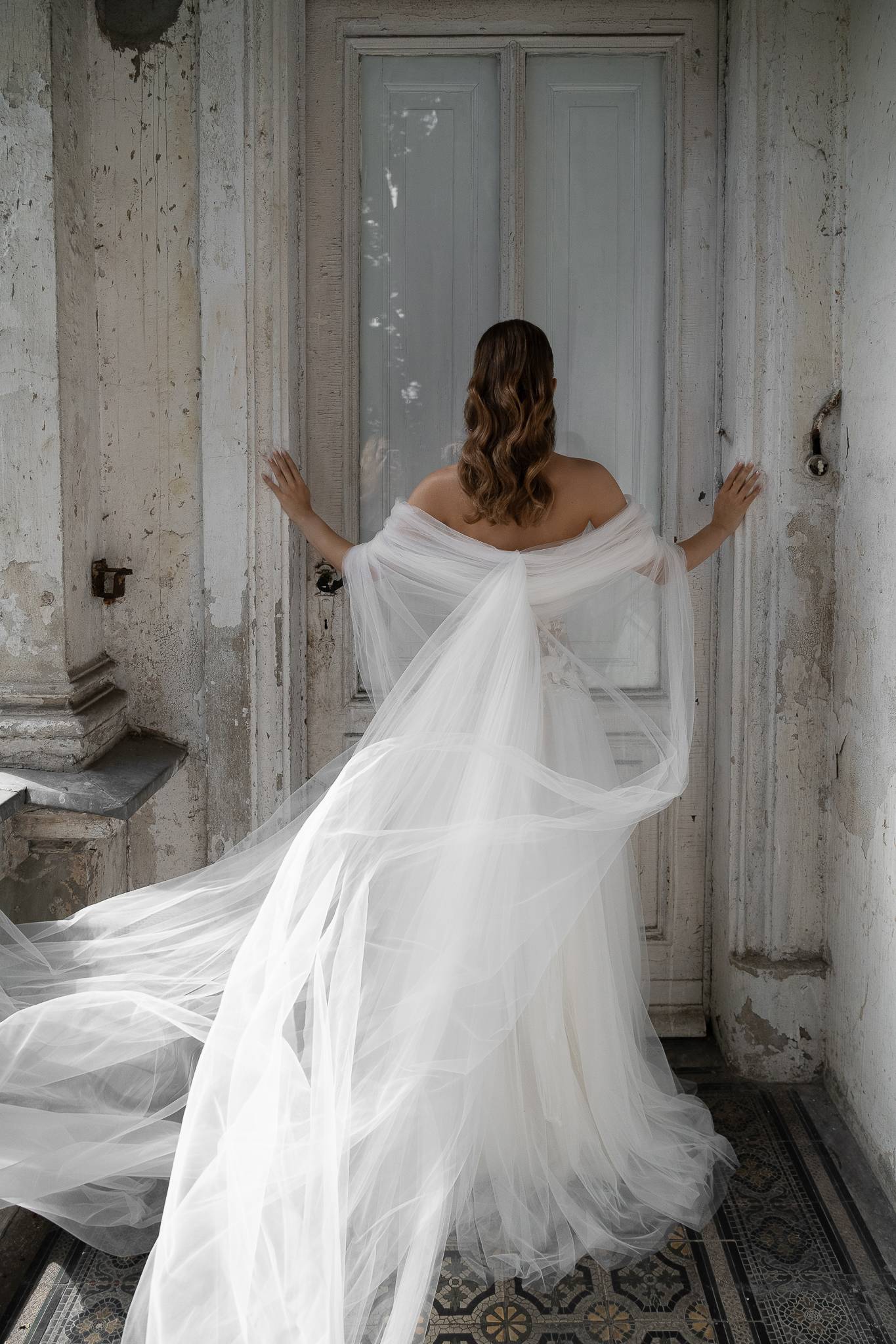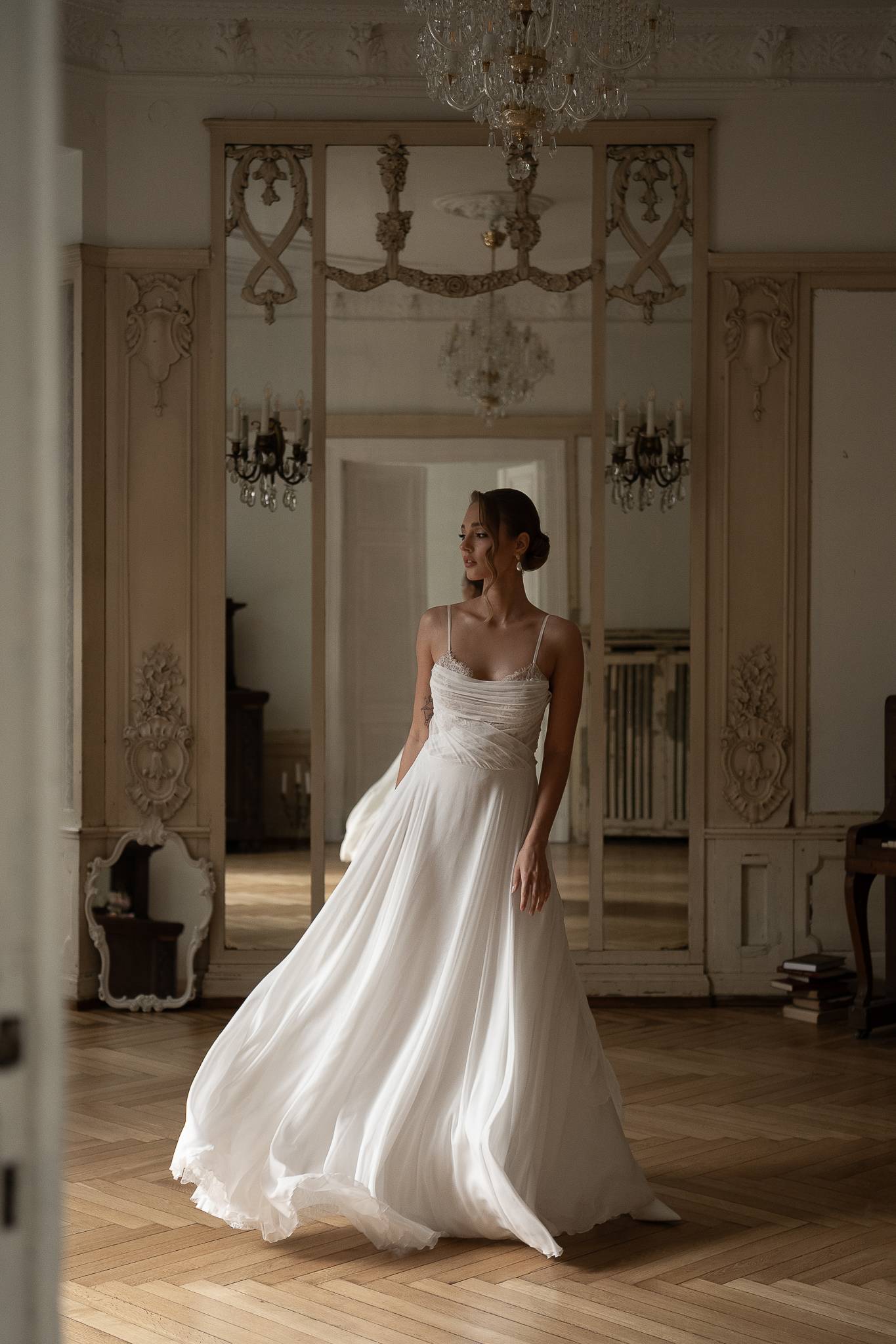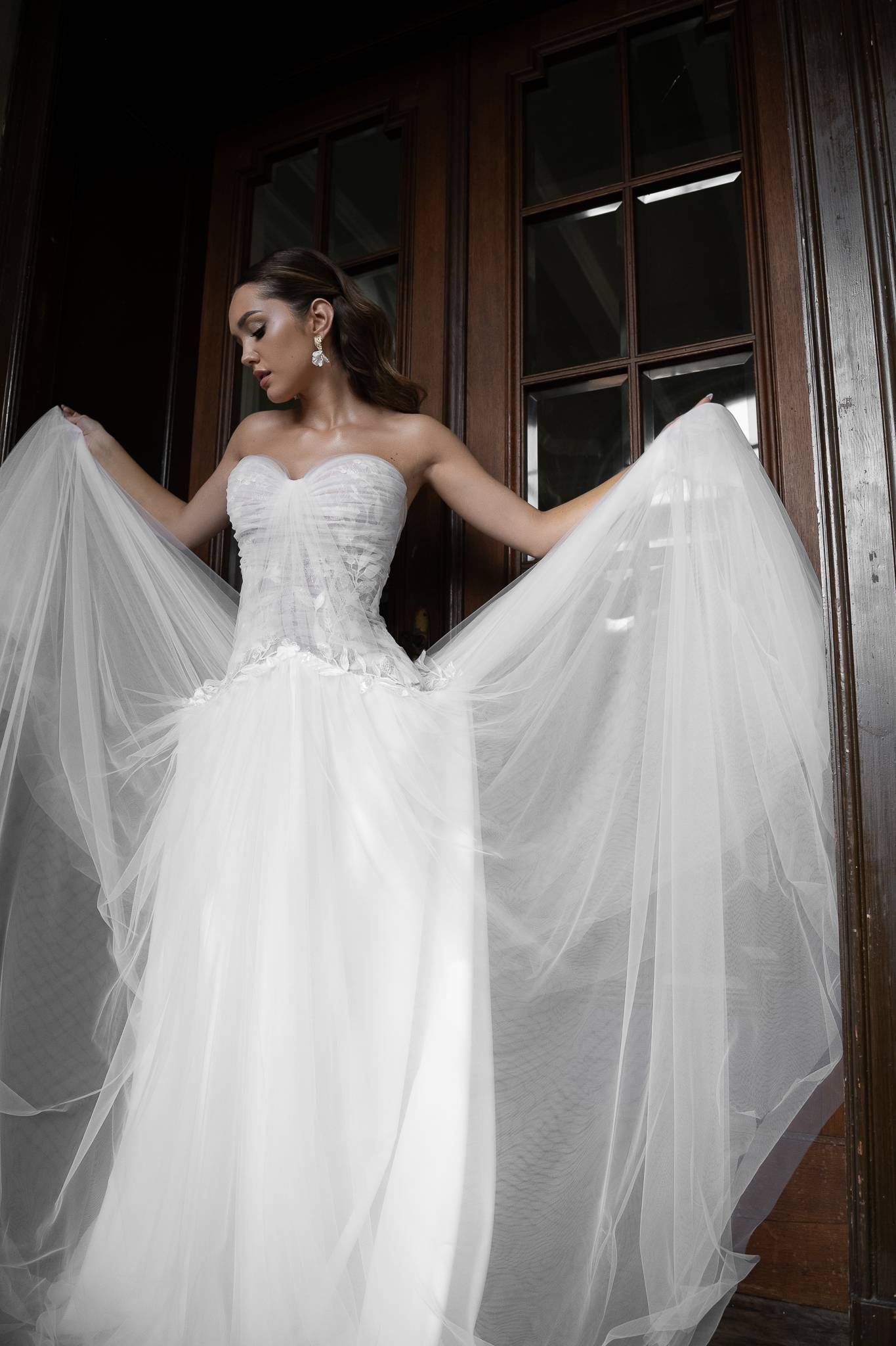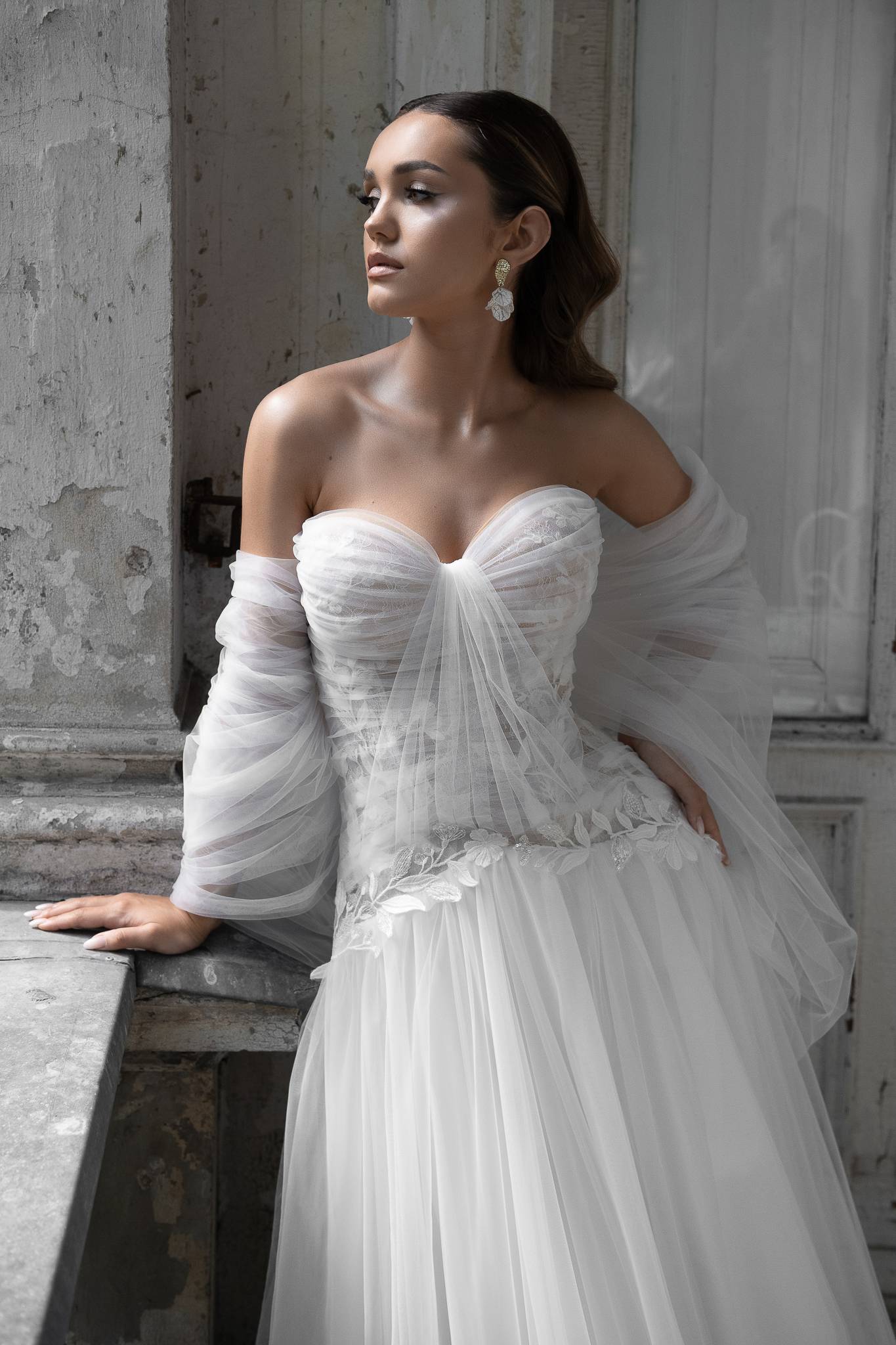 Suknia z miękkiego tiulu z gorsetem o obniżonej linii talii, bardzo dziewczęca i lekka. Koronkowe aplikacje przykryte ręcznie układanymi draperiami tworzą wyjątkową i nieoczywistą formę.