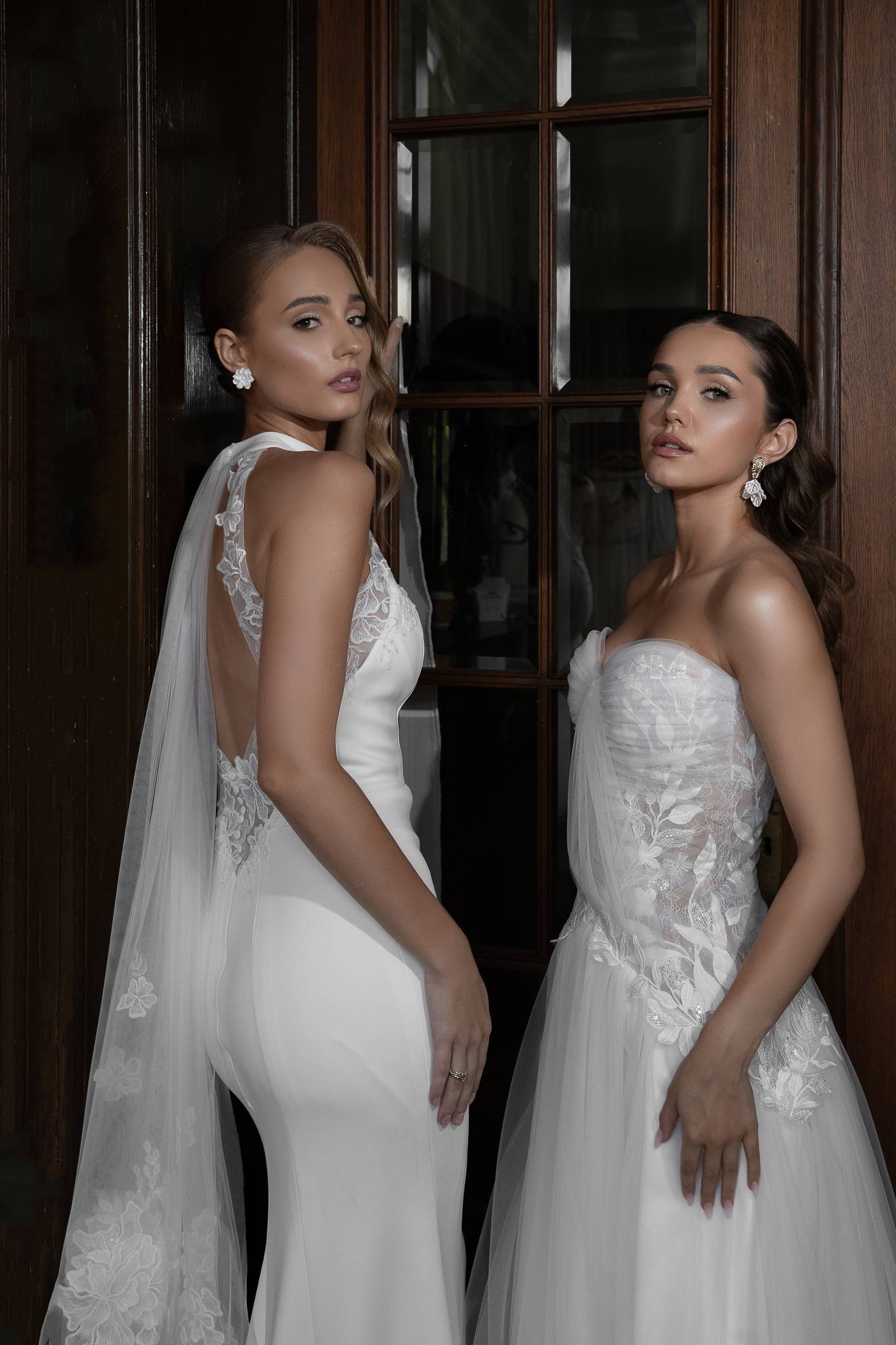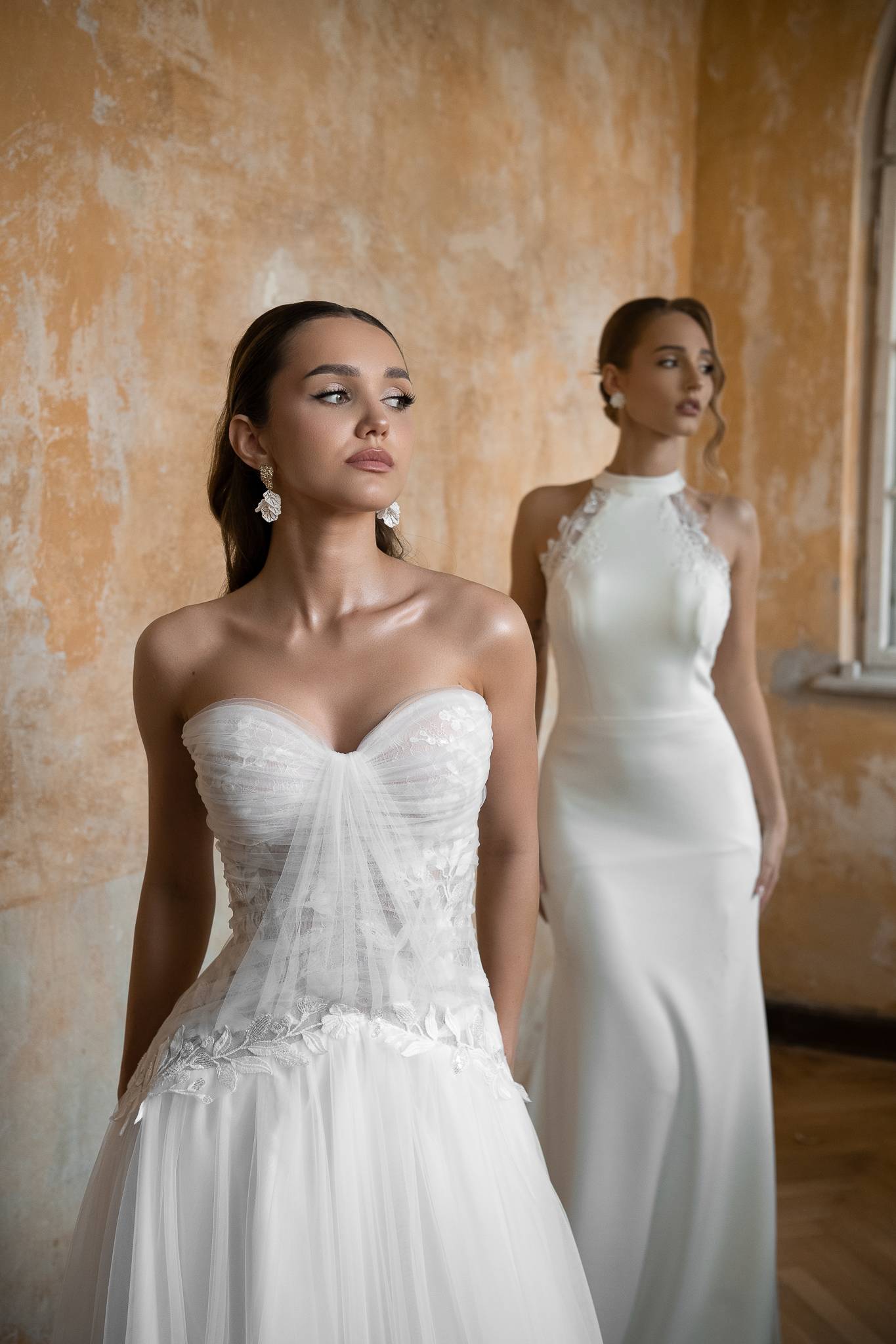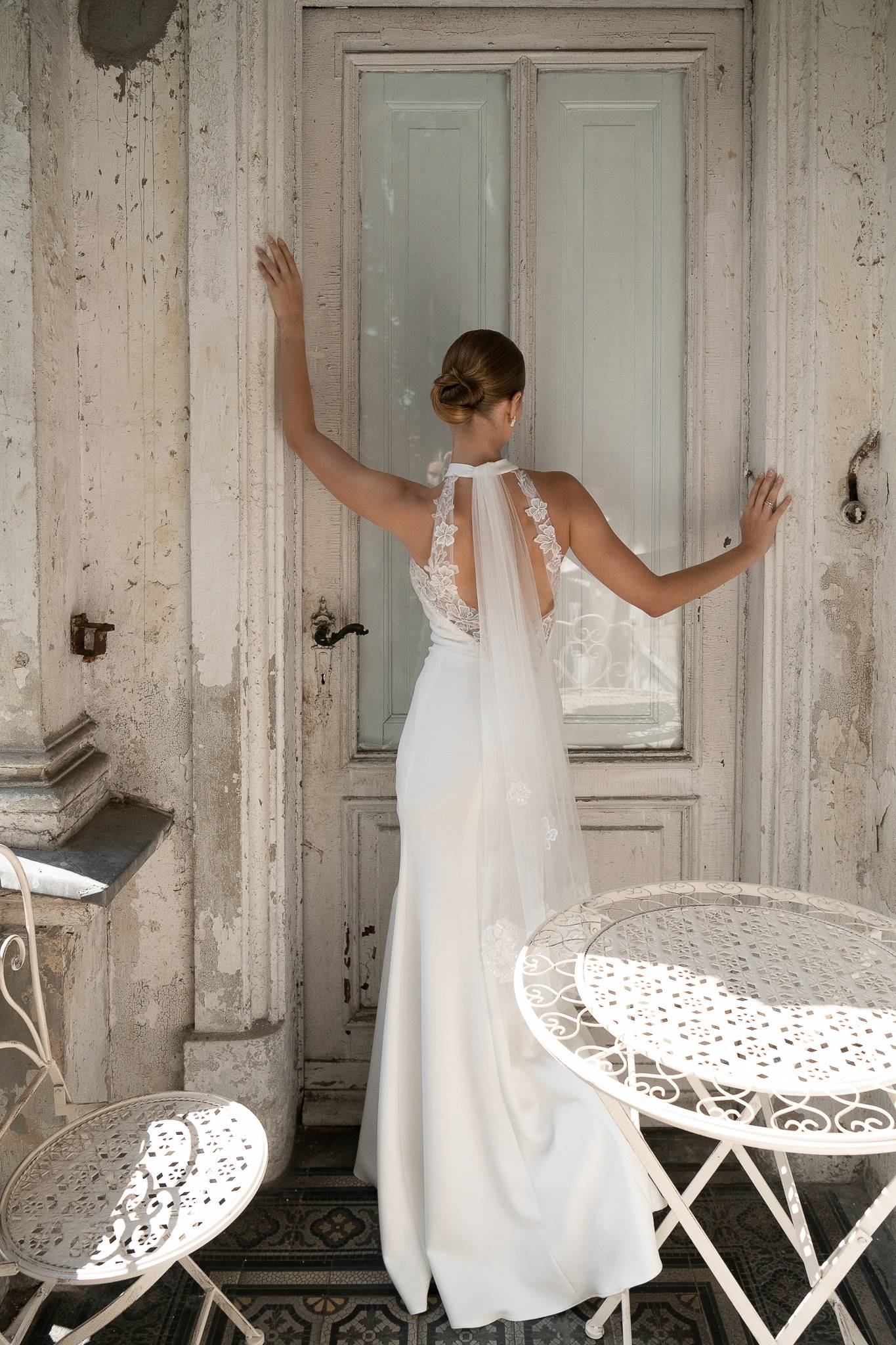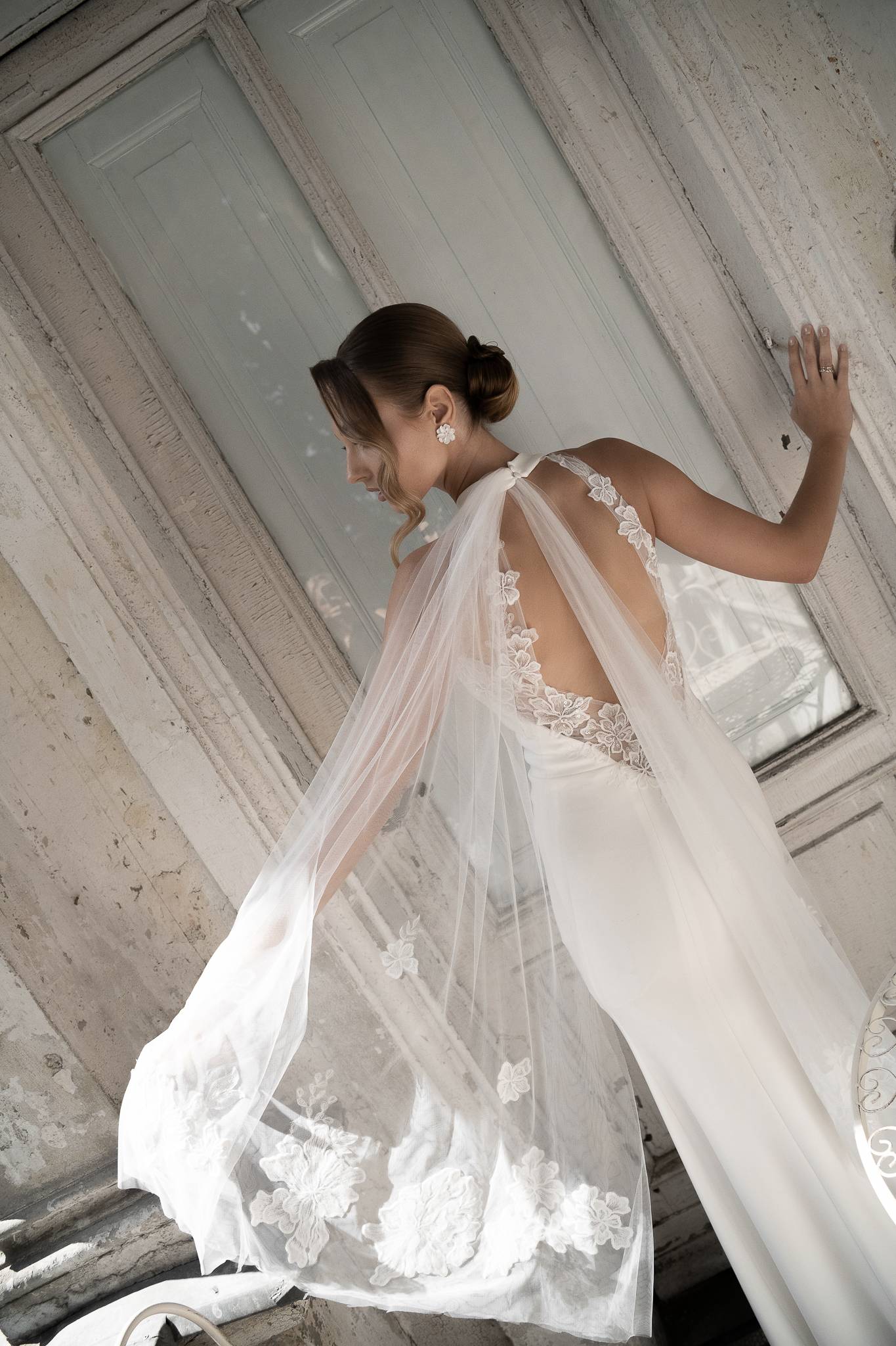 Suknia z miękkiego tiulu z gorsetem o obniżonej linii talii, bardzo dziewczęca i lekka. Koronkowe aplikacje przykryte ręcznie układanymi draperiami tworzą wyjątkową i nieoczywistą formę.