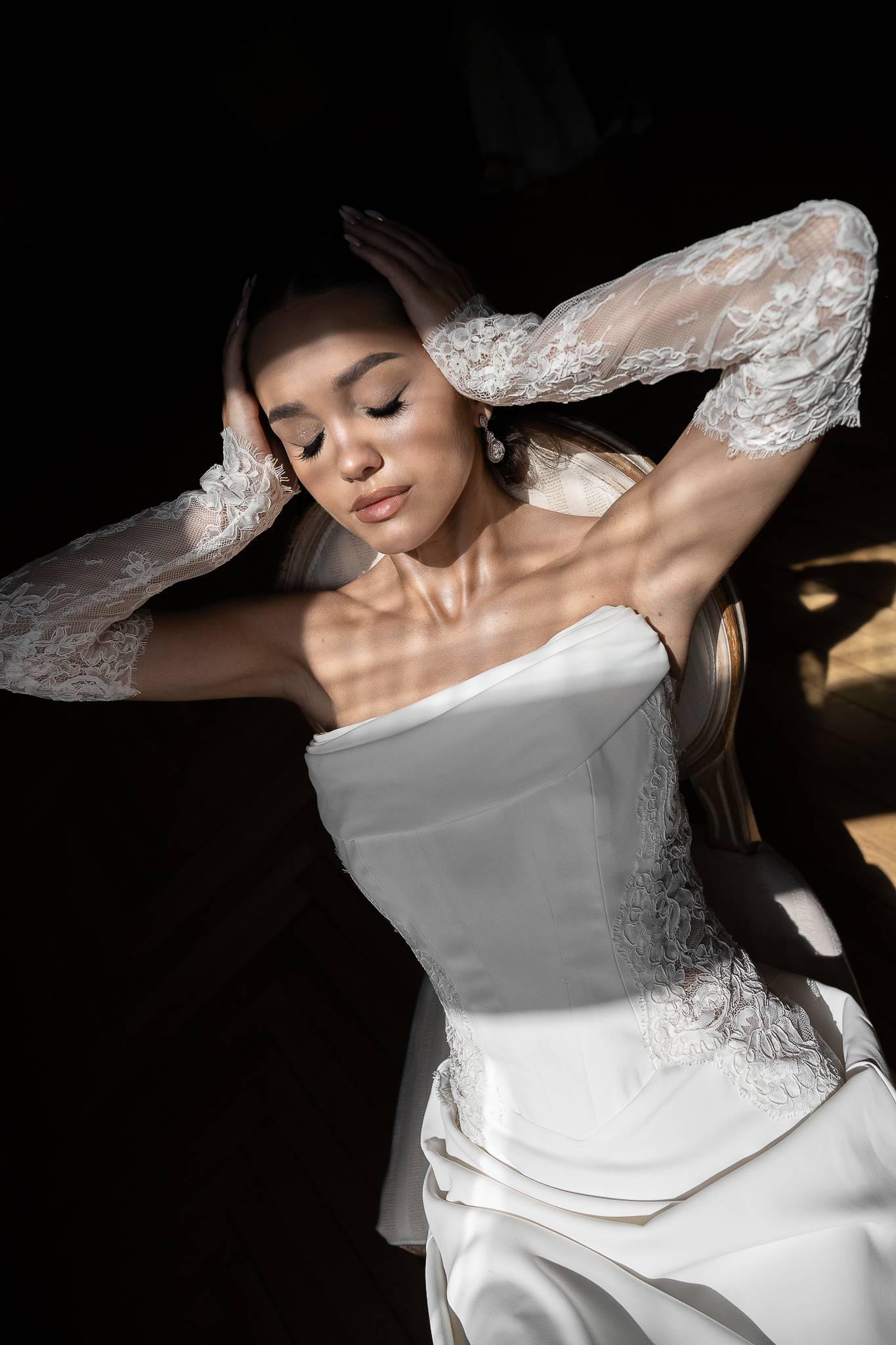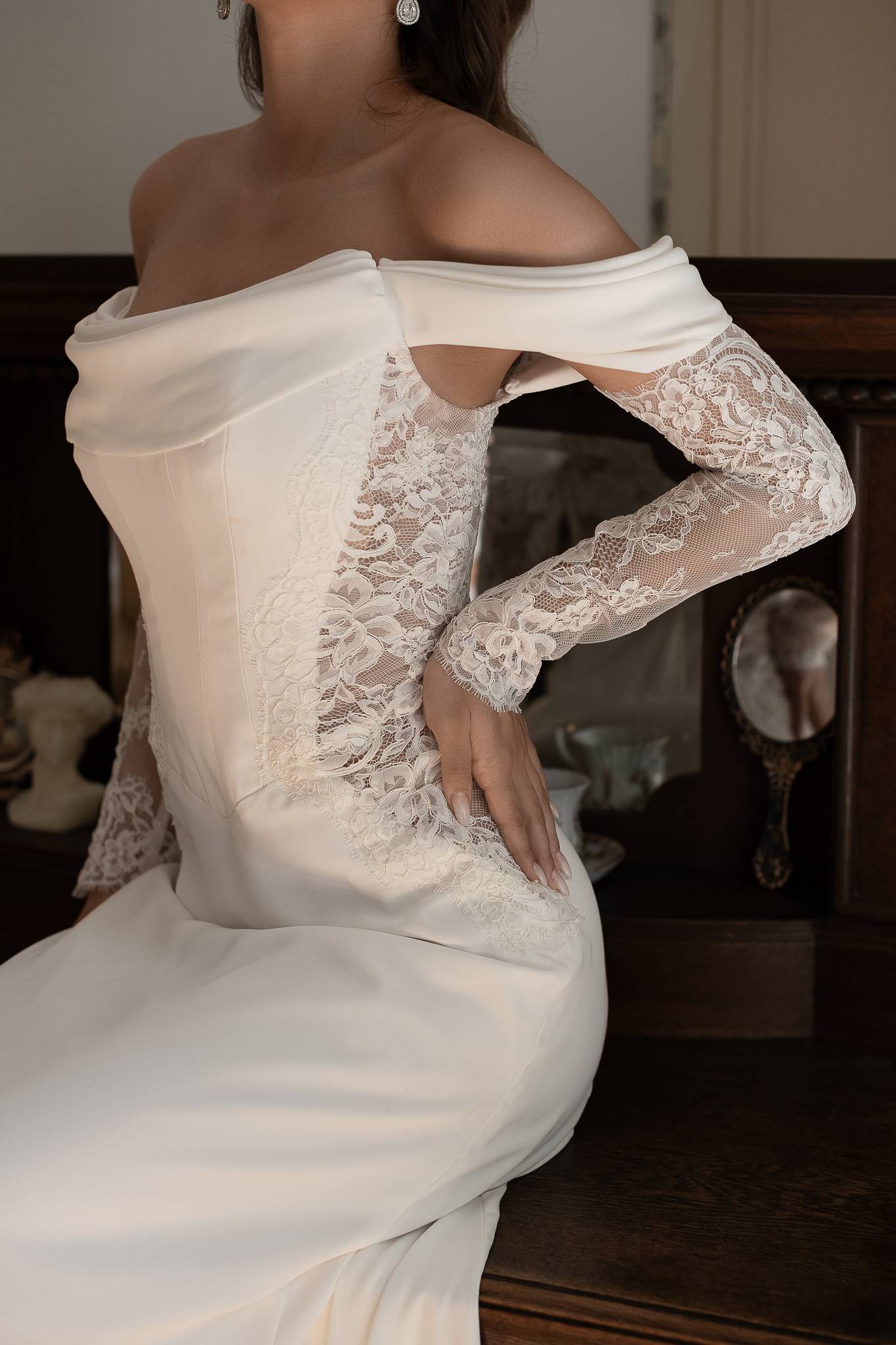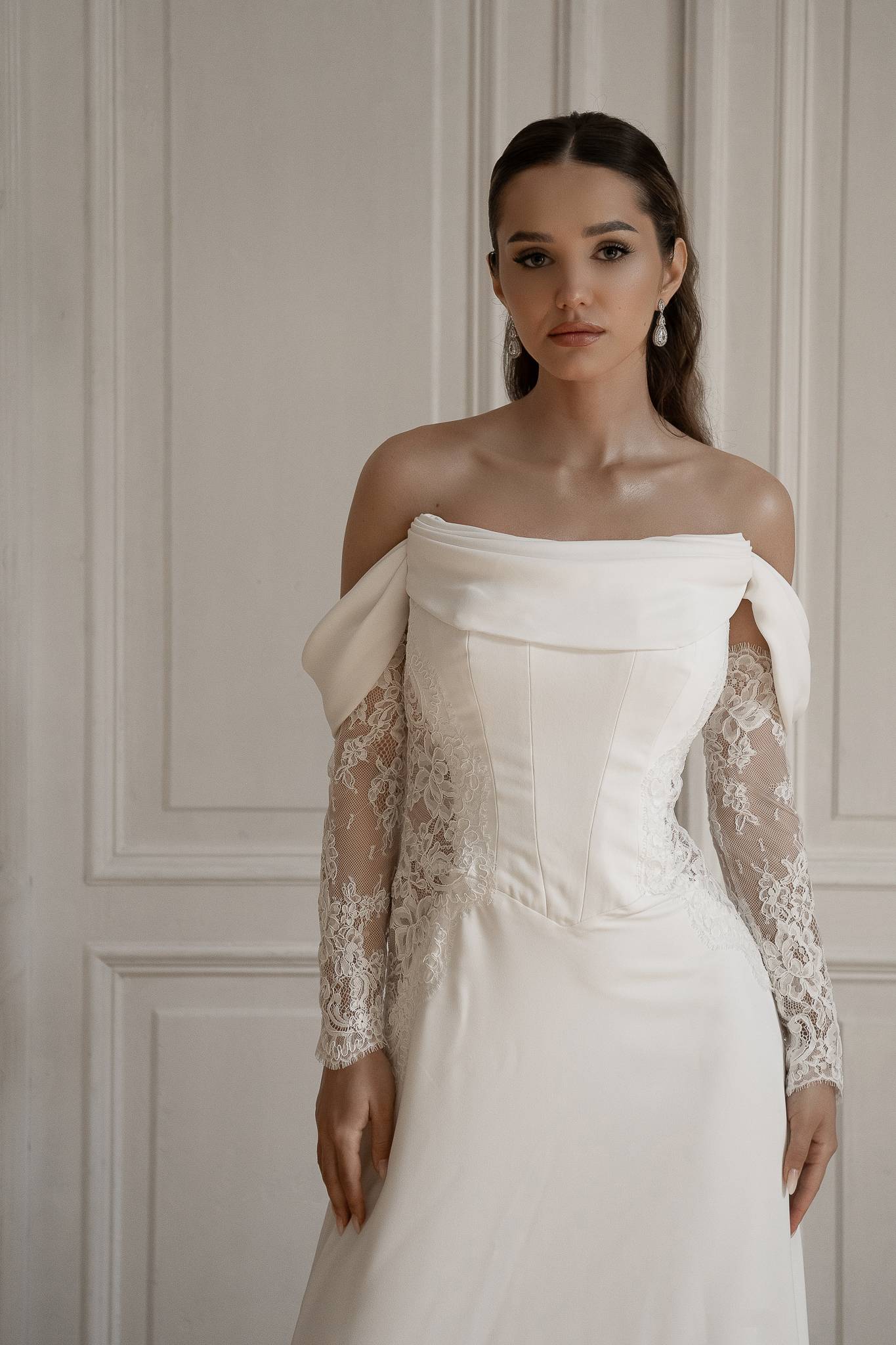 Suknia z gorsetem optycznie wyszczuplająchym talię, lejącym subtelnie opływającym sylwetkę dołem z matowej krepy. Koronkowe elementy dopełniają całóść i nadają sukni kobiecego szyku.