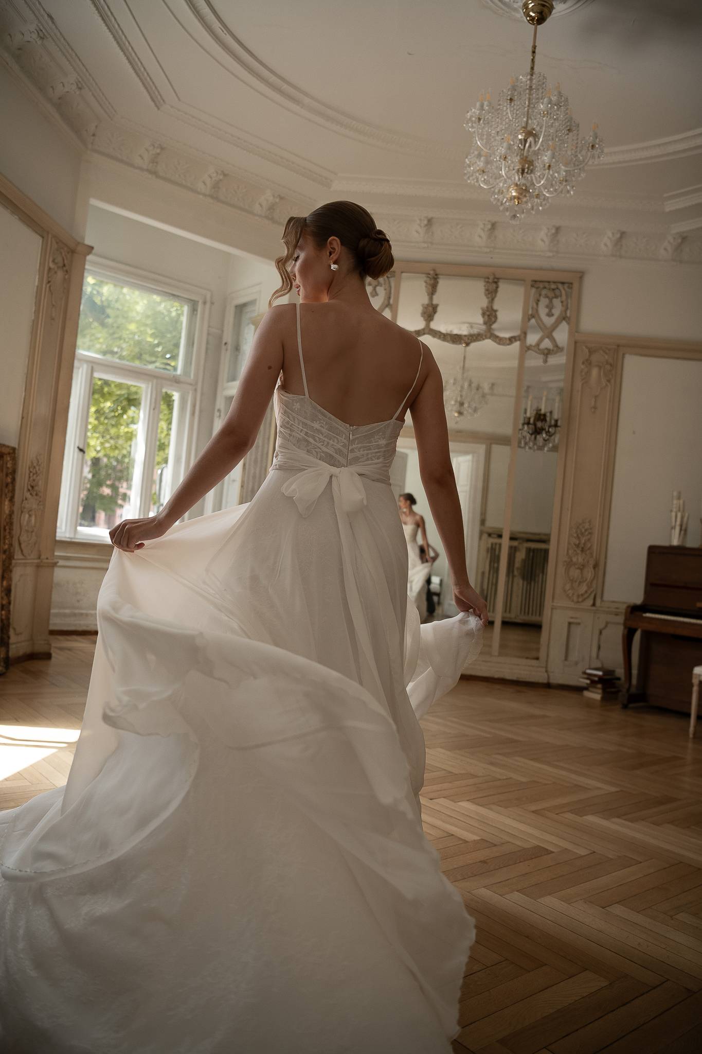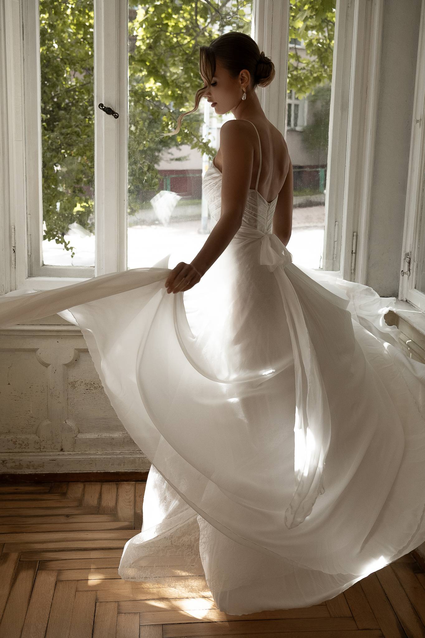 Niezwykle lekka suknia jedwabna z elementami koronki, ręcznie układanymi drapowaniami i ozdobną kokardą z tyłu. Subtelna i delikatna.