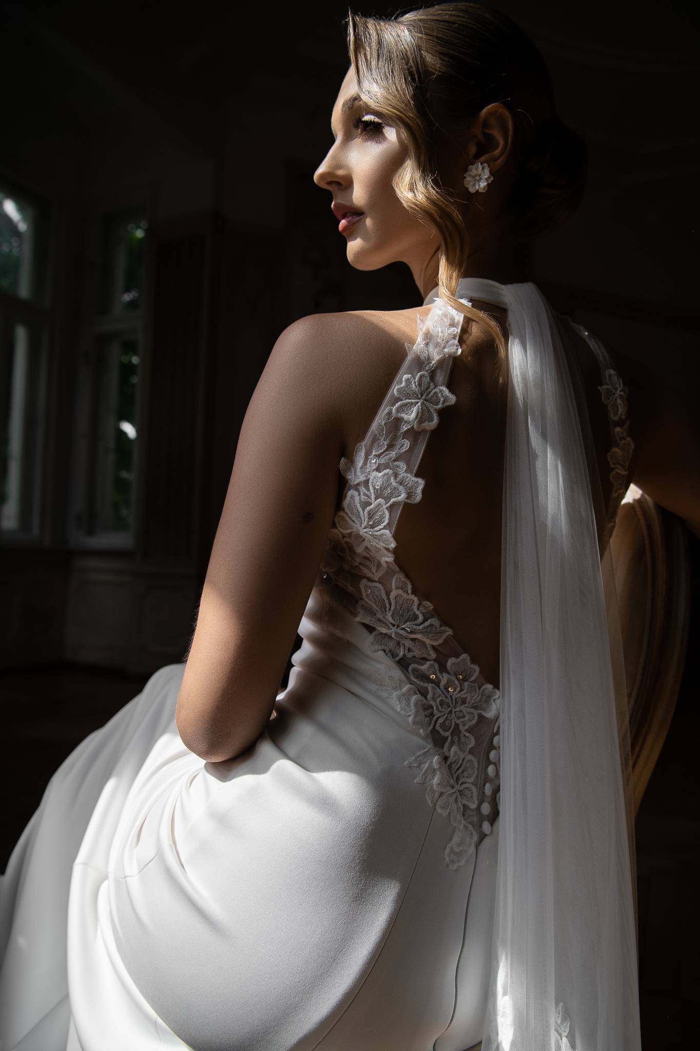 Suknia o kroju syrenki, która pięknie podkeśla sylwetkę. Niezwykle wygodna i kobieca zarazem. Uwagę przyciągają zdobione koronką plecy z dodatkowym szalem i guziczkami,